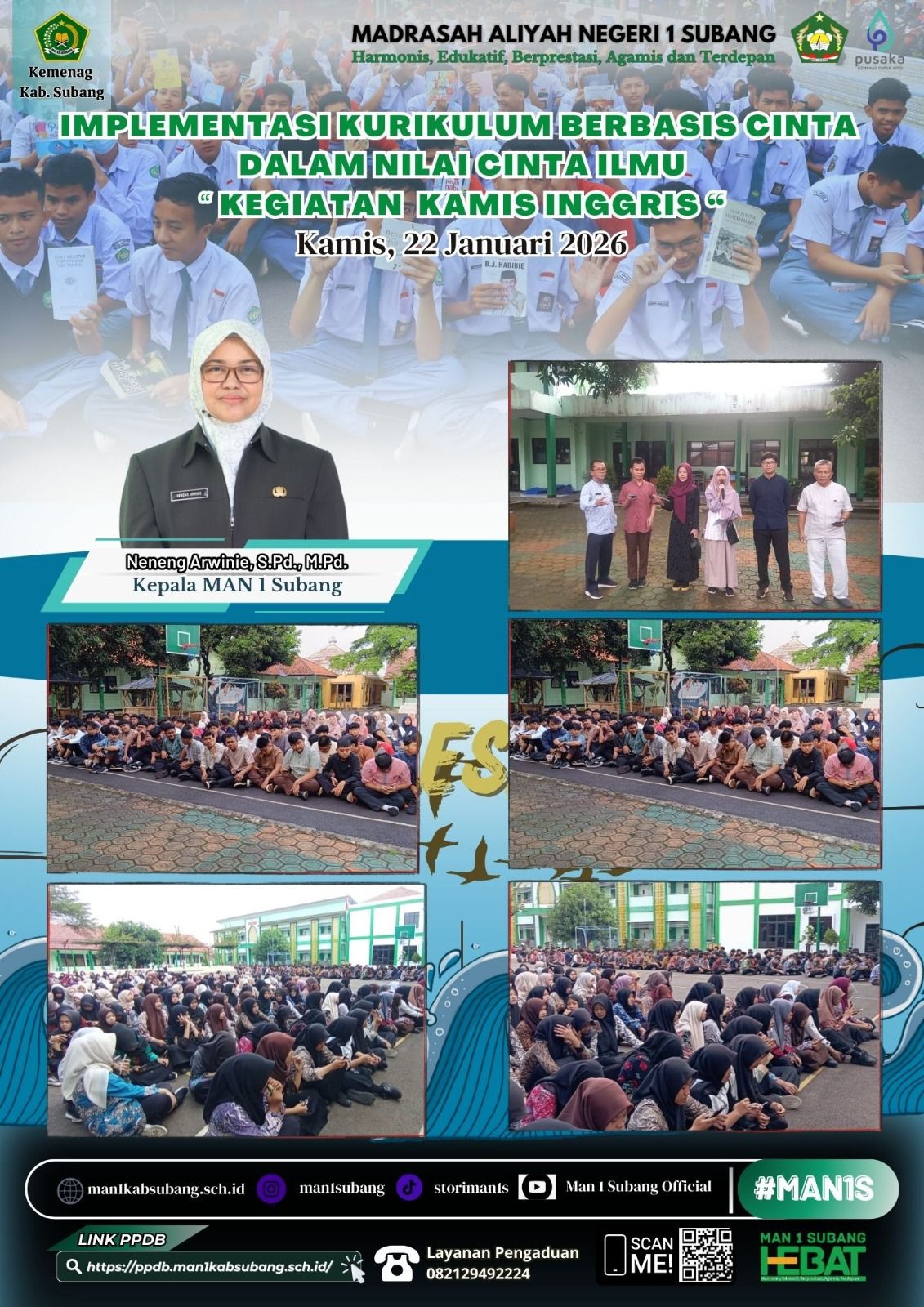 Subang, 18 Desember 2025 – MAN 1 Subang menggelar kegiatan Pembinaan Kepegawaian dan In House Training (IHT) yang berlangsung khidmat dan penuh antusias. Kegiatan ini dihadiri oleh Kepala Kantor Wilayah Kemenag Provinsi Jawa Barat, H. Dudu Rohman, S.Ag., M.Si., Kepala Biro Keuangan dan BMN Sekretariat Jenderal Kementerian Agama RI, Dr. H. Ahmad Hidayatullah, M.Pd., M. Ec. Dev., CRMP., Kepala Kantor Kementerian Agama Kabupaten Subang, Dr. H. Badruzaman, S.Ag., M.Pd., Kasubag TU Kantor Kementerian Agama Kabupaten Subang, Rd. Finy Sulistiawaty, S.E., M.AP., para pengawas dan kepala madrasah se-Kabupaten Subang, serta seluruh tenaga pendidik dan kependidikan MAN 1 Subang.